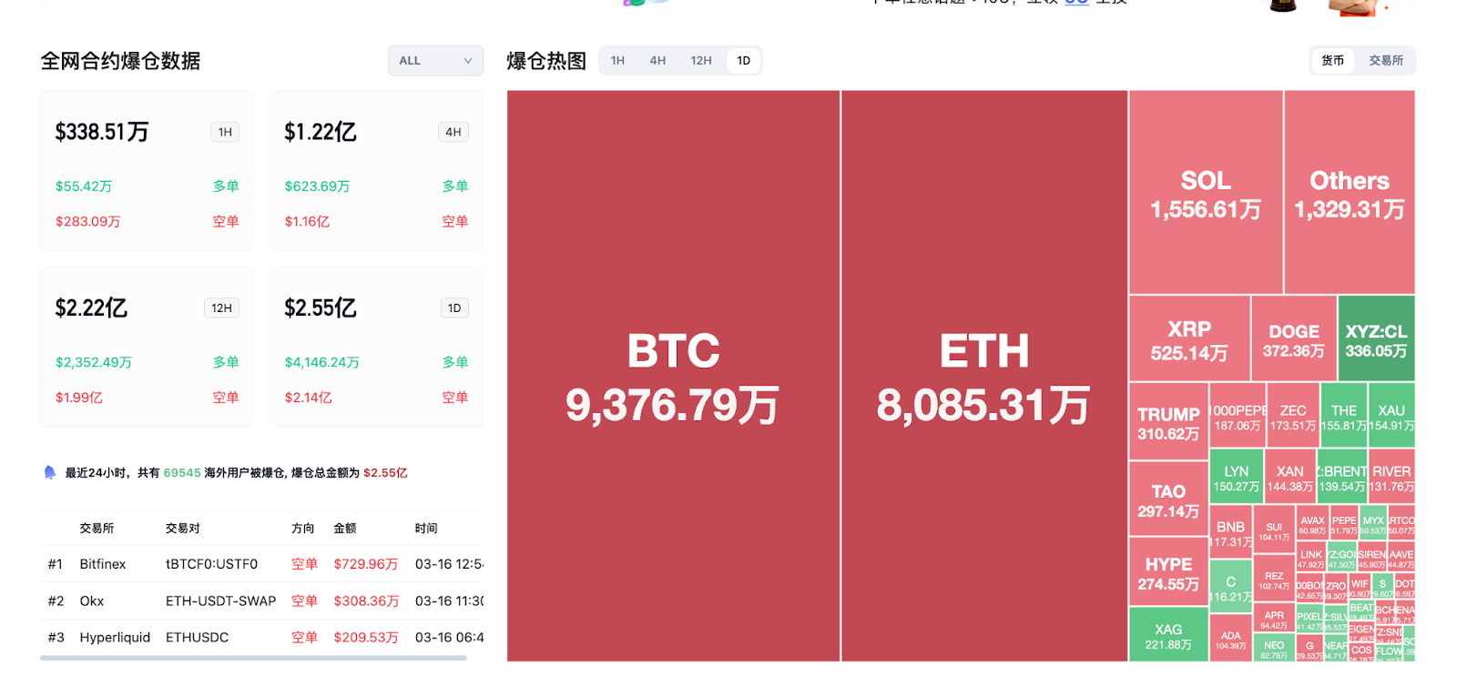24小時爆倉數據:全球共69545人被爆倉,爆倉總金額為2.55億美元,其中BTC爆倉9376萬美元、ETH爆倉8085萬美元、SOL爆倉1556萬美元。