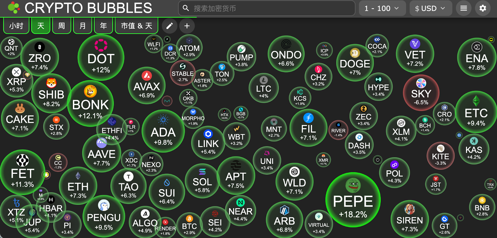 今日市值前100幣最大漲幅: Pepe漲18.2%、Bonk漲12.1%、Polkadot漲12%、ASI Alliance漲11.3%、Cardano漲9.8%。