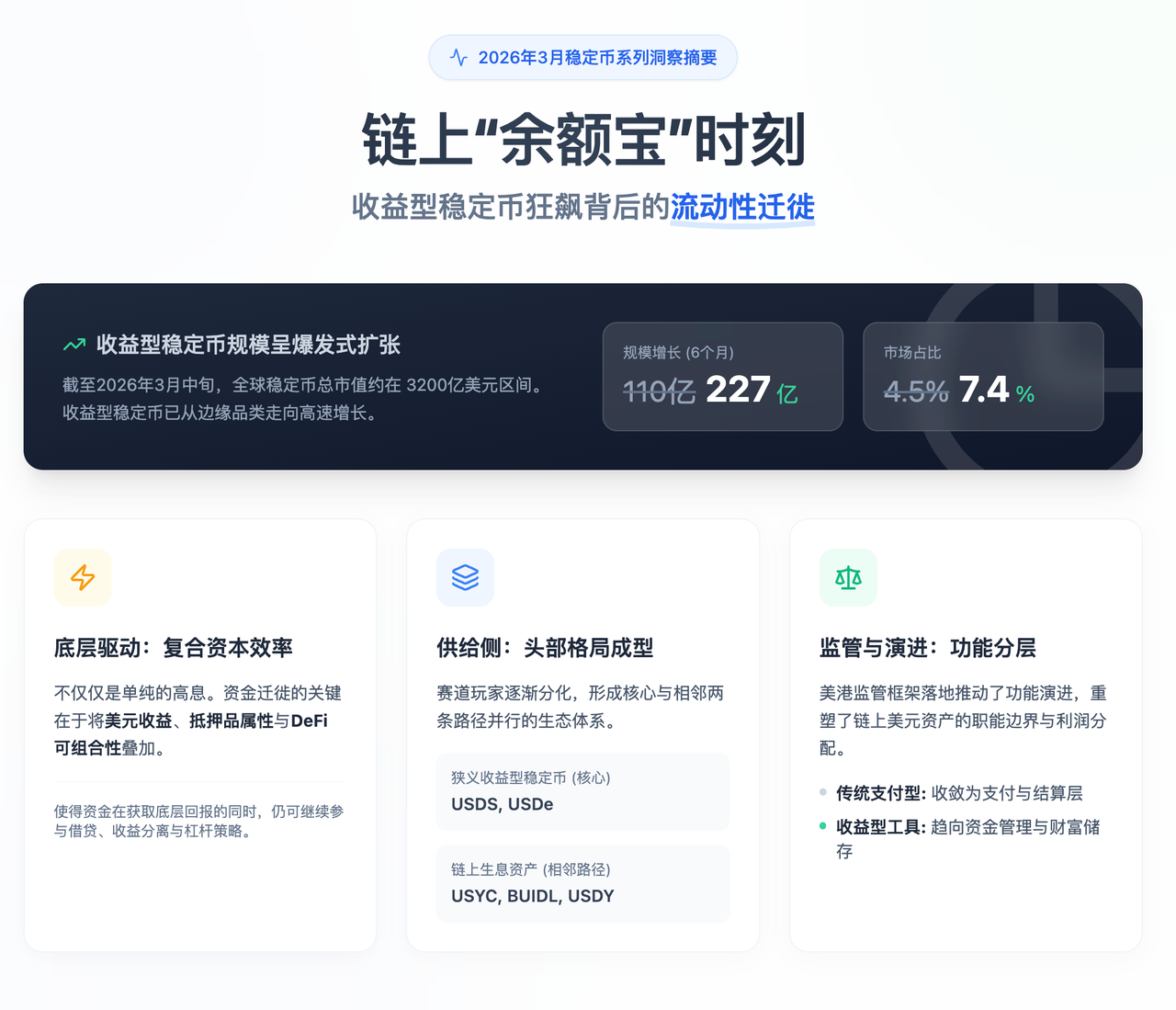CoinFound 最新研究《链上“余额宝”时刻:收益型稳定币狂飙背后的流动性迁徙》指出,收益型稳定币已经从边缘品类走向高速增长。截至 2026 年 3 月中旬,全球稳定币总市值约在 3200 亿美元区间;收益型稳定币规模约 227 亿美元,较约六个月前的约 110 亿美元明显扩张,占整体稳定币市场的比重也由约 **4.5%**升至约 7.4%