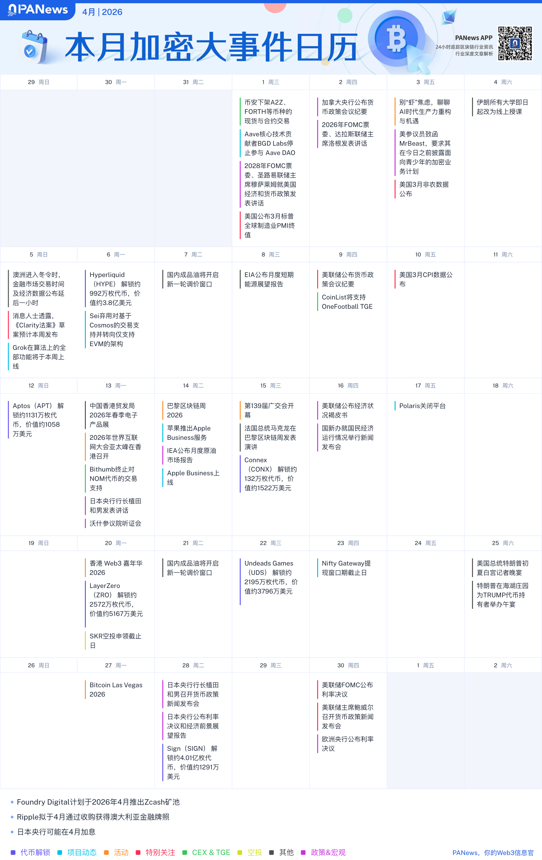 4月的加密市場,宏觀議息、監管推進、代幣解鎖與產業活動並行,核心看點: