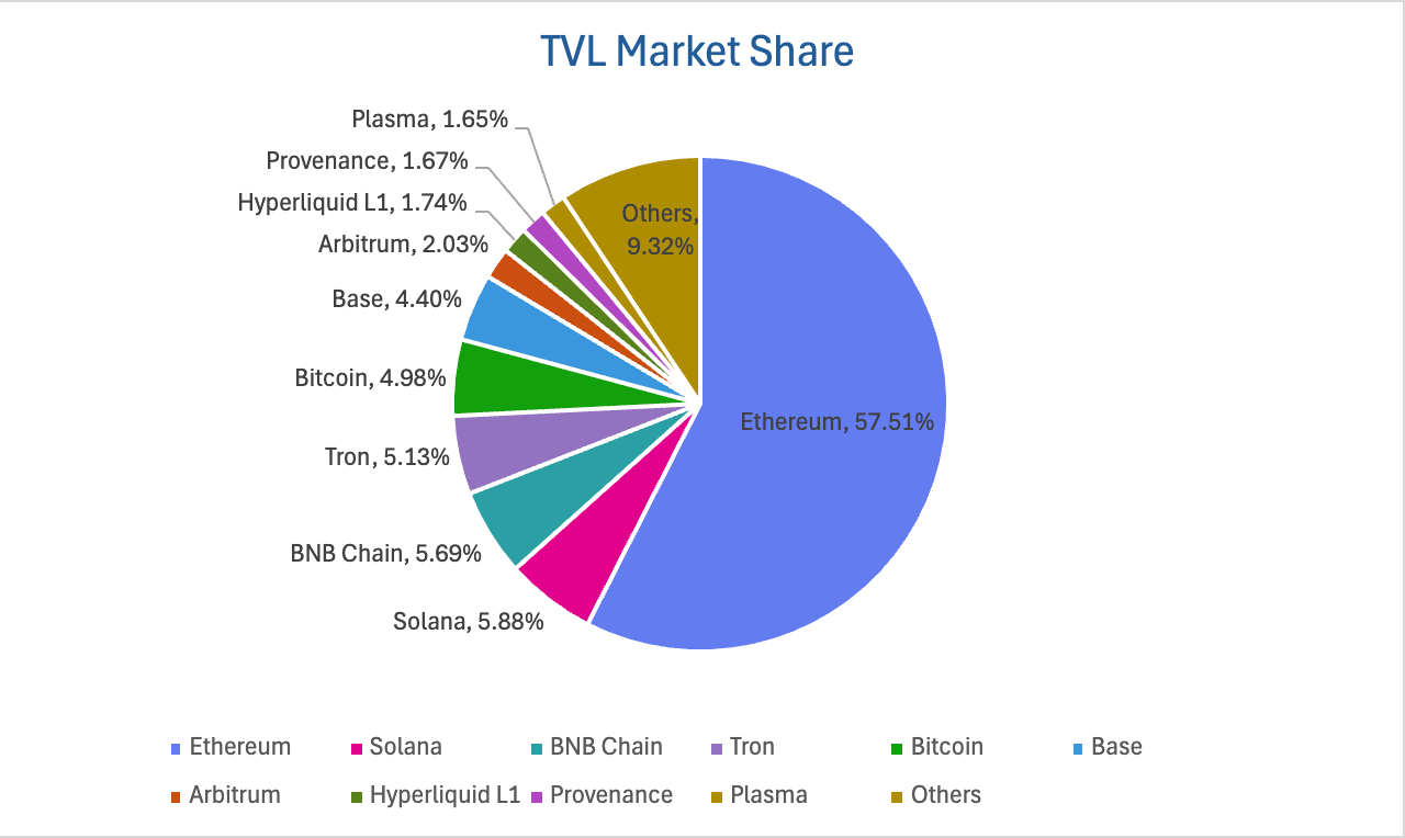 按公链进行划分,其中TVL最高的三条公链分别是Ethereum链,占比57.03%;Solana链,占比6.85%;BNB Chain,占比5.69%。