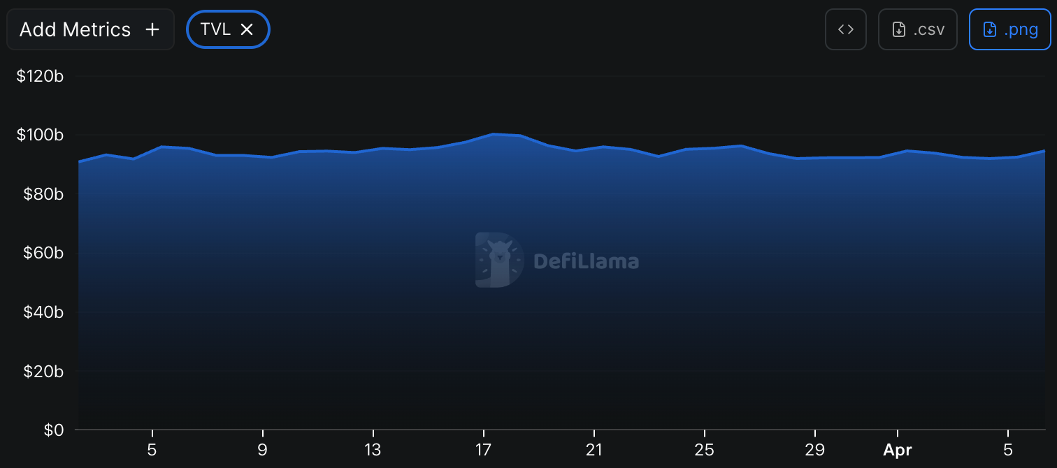据DeFiLlama的数据,本周DeFi总TVL为$945.24亿,较上周$927.69亿,上升约1.89%。