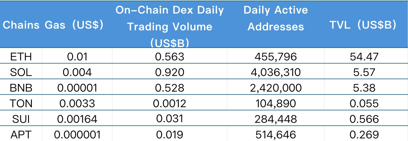 主要从日交易量、日活跃地址、交易费用分析目前主要Layer1含ETH、SOL、BNB、TON、SUI以及APTOS的相关数据。