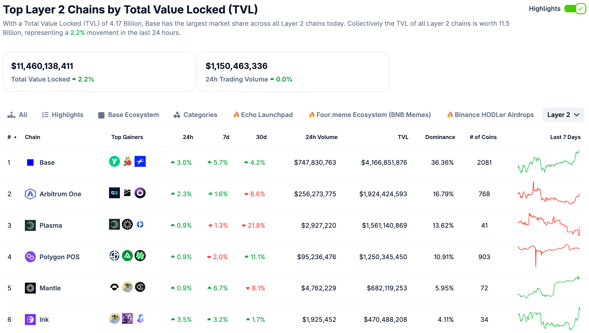 数据来源:CoinGecko, https://www.coingecko.com/en/chains/layer-2