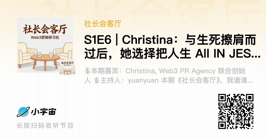 本期《社长会客厅》,我邀请到了一位在 Web3 行业里非常特别的从业者——Christina。她的职业路径横跨传统媒体、公关公司、海外华人电视媒体,到 2018 年进入加密行业成为交易所品牌负责人,如今以更自由的方式参与 Web3 项目合作。