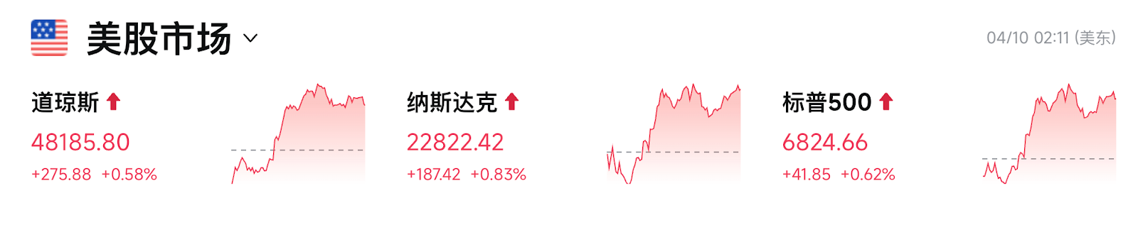 美股多頭在停火協議的利多中狂歡,標普500指數豪取七連漲,創下自2025年10月以來的最長連漲紀錄。道瓊指數上漲0.58%至48185.80點,那斯達克指數上揚0.83%報22822.42點,標普500指數則攀升0.62%至6824.66點。彭博策略師Michael Ball表示,6800點已成多空交戰的關鍵分界線,市場正在利好頭條與潛在懷疑中艱難權衡。