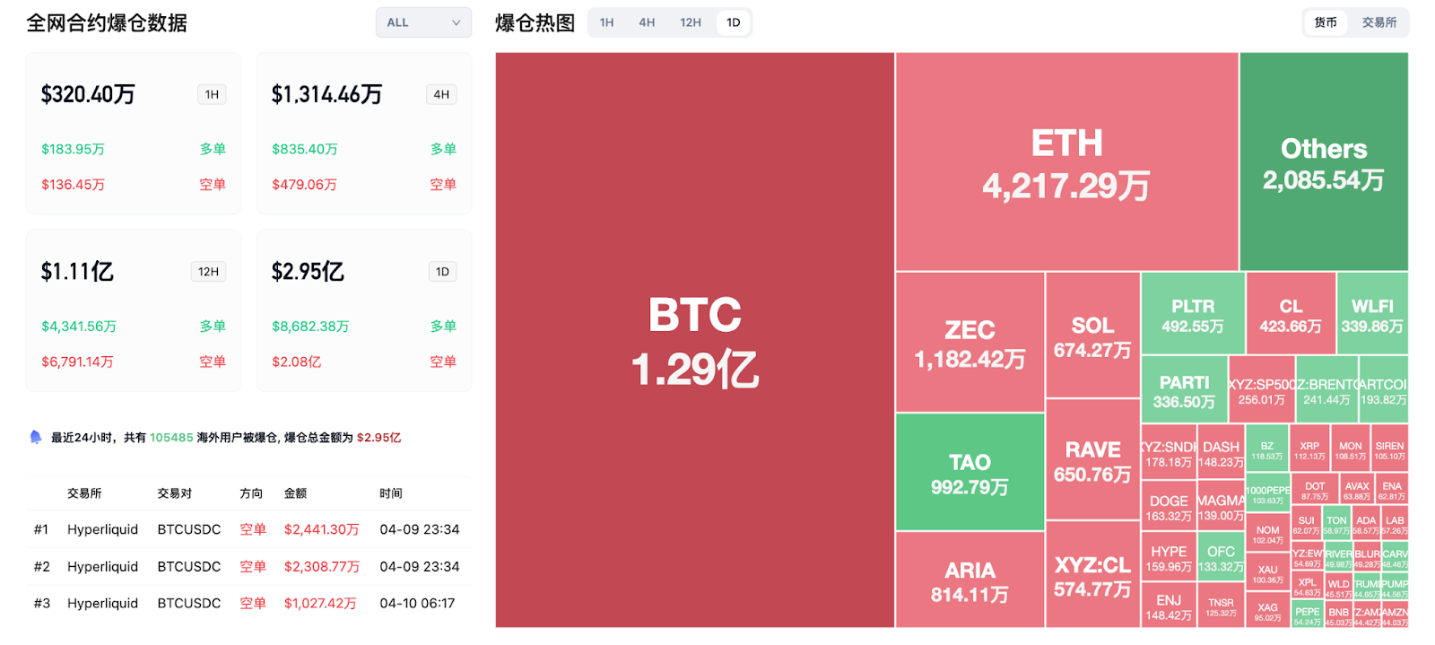24小時爆倉數據:全球共105485人被爆倉,爆倉總金額為2.95億美元,其中BTC爆倉1.29億美元、ETH爆倉4217萬美元、ZEC爆倉1182萬美元。