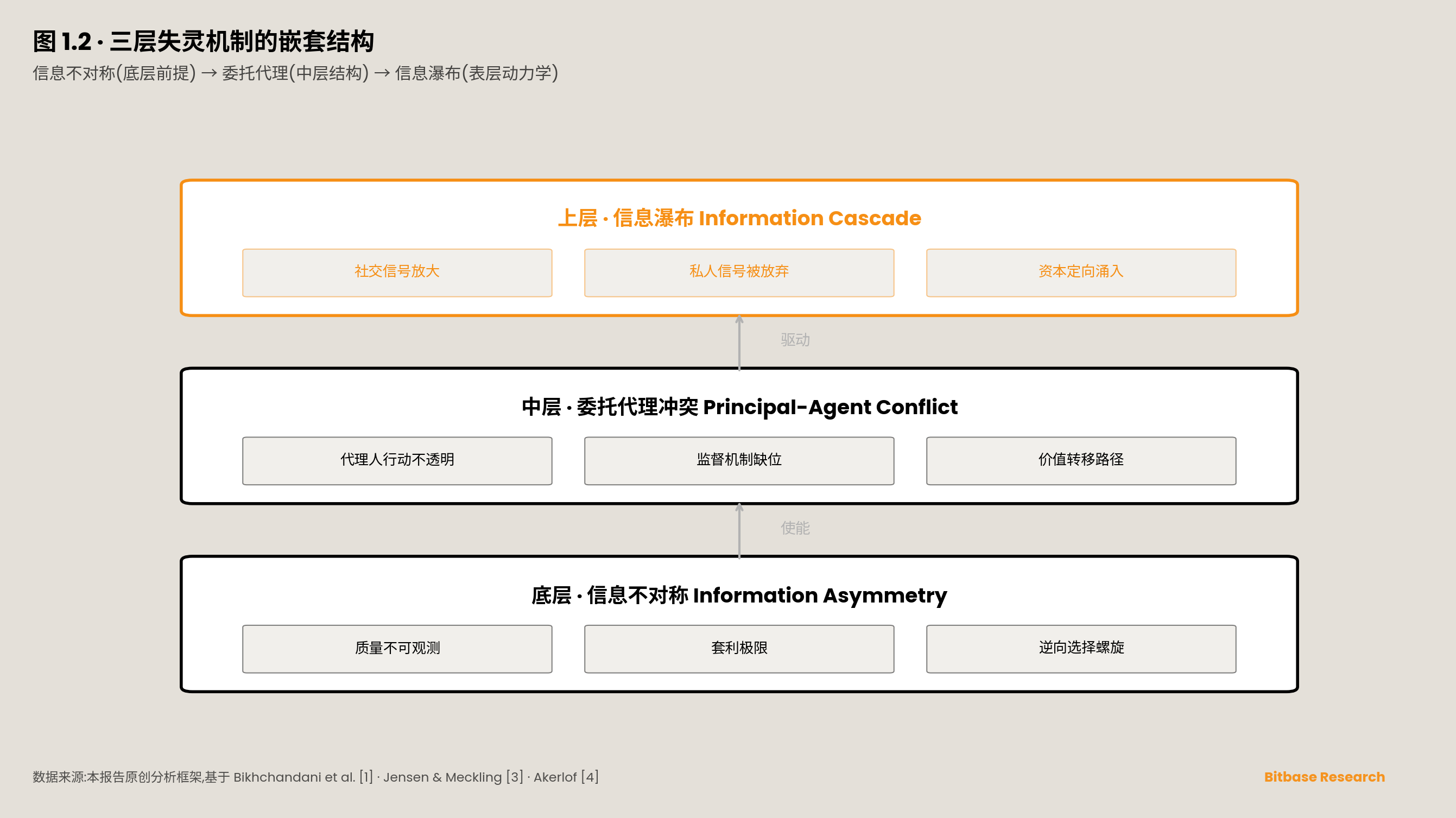 将上述三根理论支柱并列,并不足以刻画加密市场当前的系统性失灵。三者在逻辑上并非并列,而是嵌套。信息不对称是底层前提:它界定了买方、卖方、委托人、代理人各自持有何种私人信息,并规定了监督与识别的边界条件。委托代理问题是中层结构:它描述在信息不对称给定的条件下,决策权与资产托管权的授予如何转化为可被代理人攫取的经济价值 — — 代理成本的规模由底层信息结构决定,但其实际实现则由契约设计、监管强度与剩余索取权分布共同决定。信息瀑布是表层动力学:它描述当代理结构已经内嵌价值转移路径、信息不对称又排除了事前识别手段之后,资本如何在短时间窗口内被定向引导至特定标的 — — 瀑布的速度与幅度,取决于公开行动信号的可见度、私人信号的强度以及参与者的决策顺序。