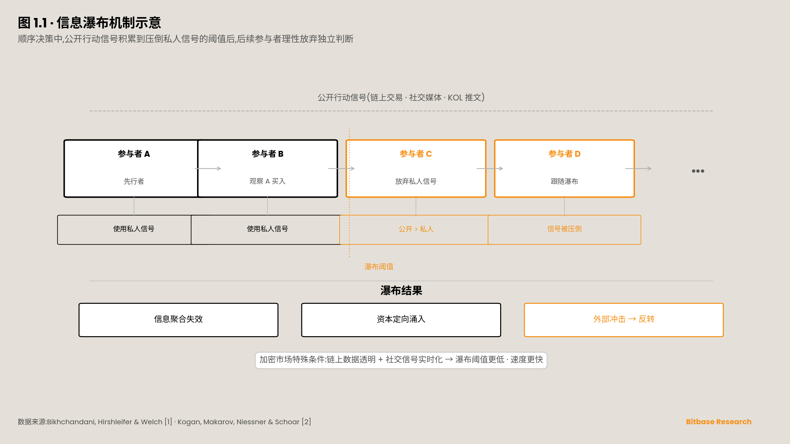 Bikhchandani 等人 [1] 的原始模型建立在离散选择与有限信号空间之上,此后被扩展到金融市场、社会传播、组织决策等多个领域。但是,将这一理论用于解释 2020 年后的加密市场时,需要一个关键的机制性修正:加密市场的“公开行动”不再仅是买入或卖出,而是链上可见的钱包地址、持仓分布、交易时序,以及社交媒体上的点赞、转发与互动指标。这意味着先行者的行动被显性化、可量化、且可被机器解析 — — 瀑布形成的阈值因此显著降低,传播速度显著提升。