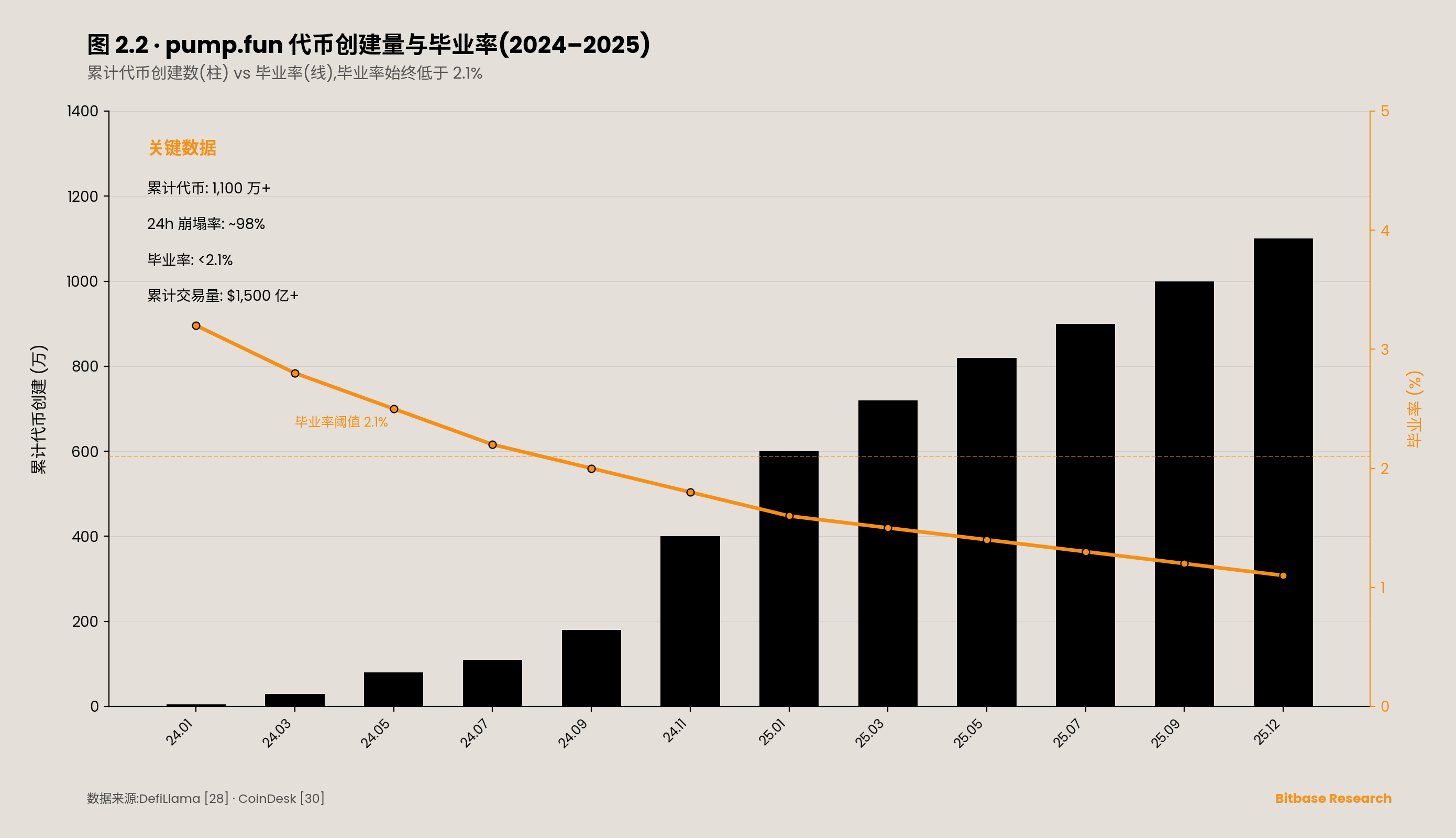 截至 2025 年底,pump.fun 累计创建代币超过 1,100 万个,高峰期每日新增约 65,000 个。该平台在其运营期间占据 Solana 链上代币创建量的 80% 以上。根据 DefiLlama 的统计 [28],其累计 DEX 交易量超过 1,500 亿美元。[⁴] 峰值月收入达到 1.38 亿美元,单日收入峰值约 1,500 万美元。