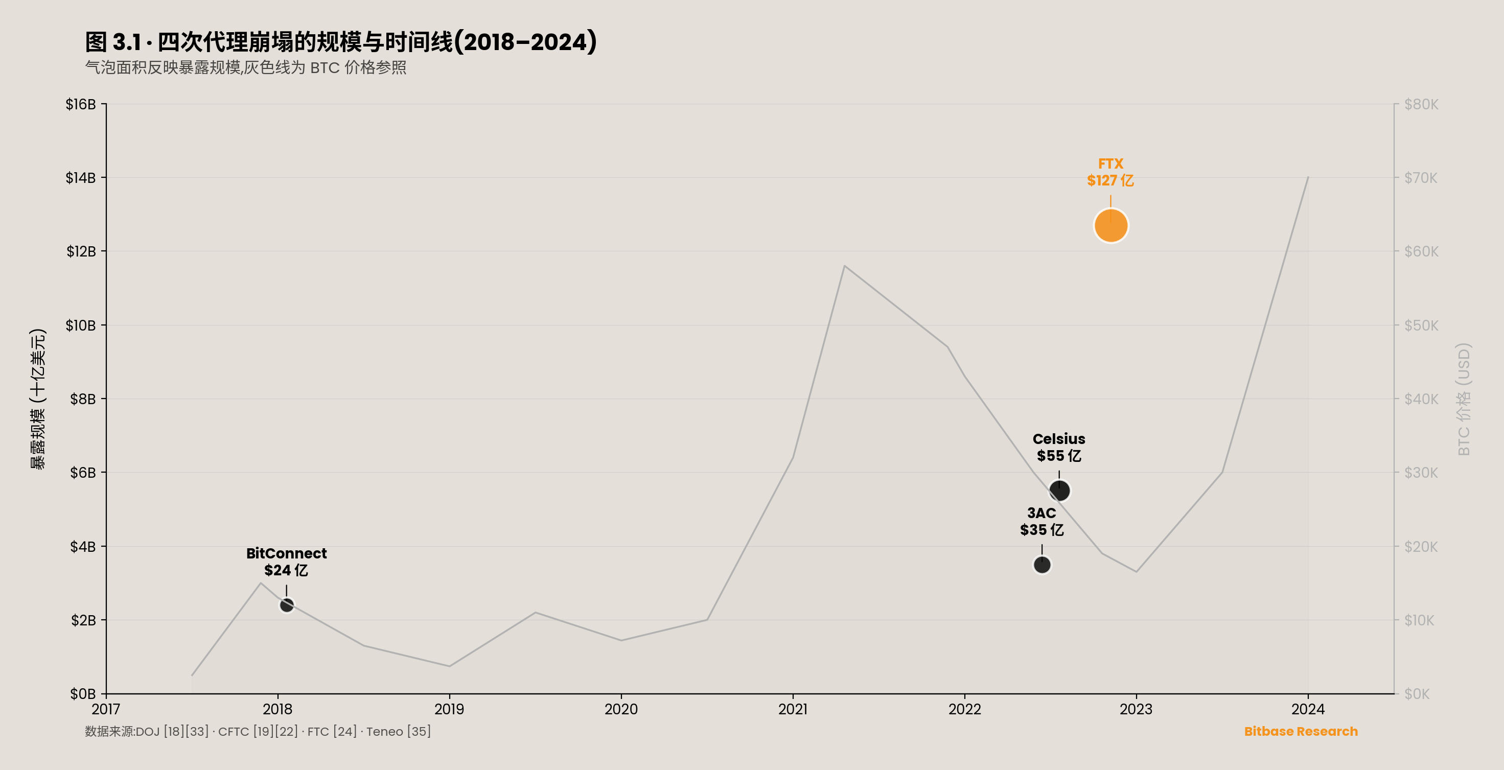 2016 年至 2022 年的六年间,加密市场出现了四次规模化的代理崩塌事件,每一次都以不同的业务形态呈现,但在代理结构层面共享同一组前提条件。BitConnect(2016–2018)以“借贷程序”名义吸纳投资者资产,美国司法部起诉书认定欺诈规模约 24 亿美元。Three Arrows Capital(2022 年 6 月崩塌)以加密对冲基金形态运营,清算文件显示欠 27 个债权人合计约 35 亿美元。Celsius Network(2022 年 7 月申请破产)以“高息储蓄”叙事吸纳个人存款,首日破产文件披露总负债约 55 亿美元,其中客户无担保债权约 47 亿美元。FTX(2022 年 11 月崩塌)以交易所托管身份持有用户资产,CFTC 终审判决认定货币救济金额 127 亿美元