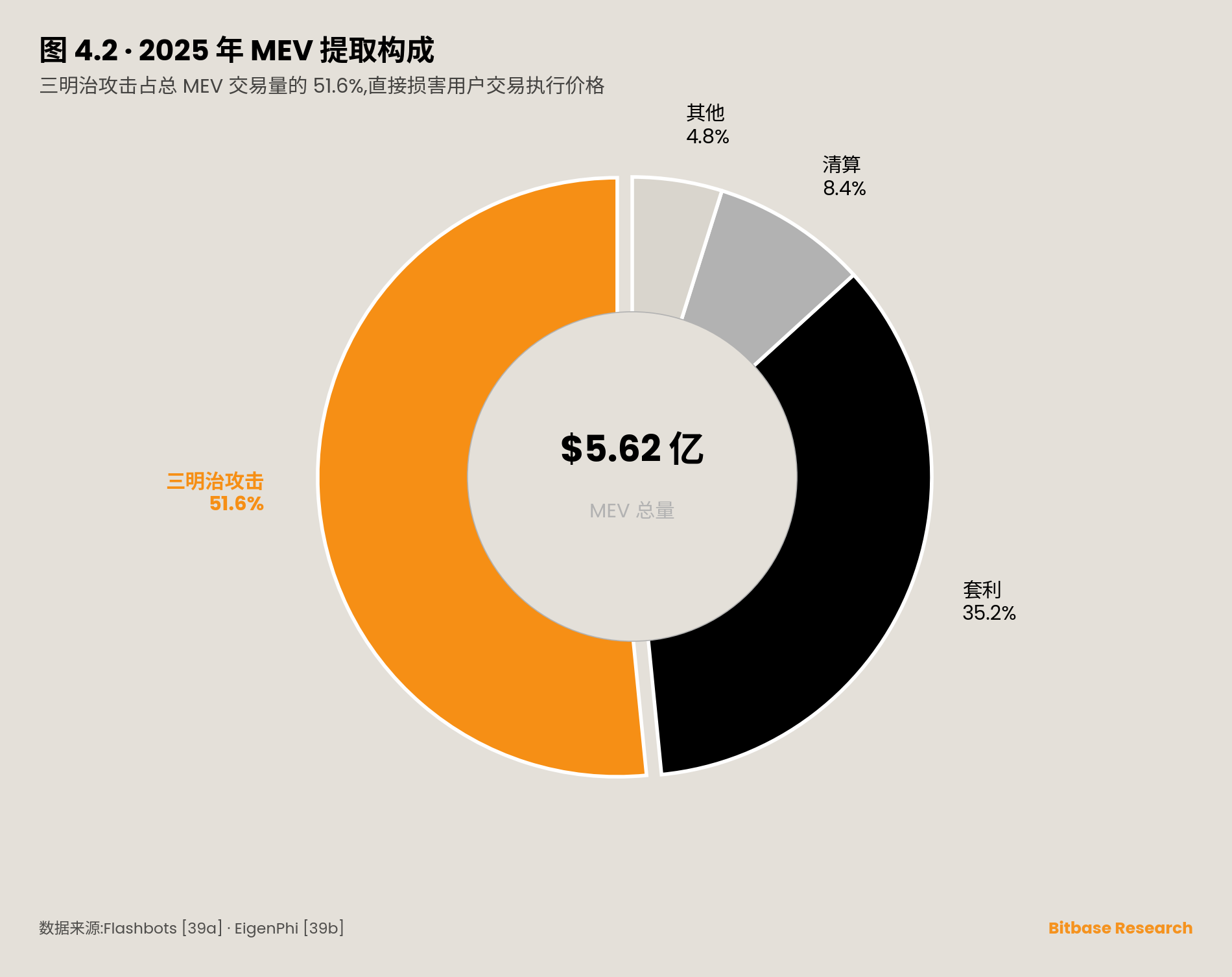 MEV 的规模已不可忽略。2025 年的数据 [39a][39b] 显示,三明治攻击占总 MEV 交易量的 51.56%,金额约 2.9 亿美元,占总 MEV 金额 5.62 亿美元的过半。这意味着超过一半的 MEV 提取直接损害了普通用户的交易执行价格 — — 用户付出了比公平价格更高的成本,差额被 MEV 搜索者和区块构建者捕获。在以太坊上,超过 81% 的验证者已注册 MEV-Boost(Flashbots 的区块构建中继),MEV-Boost 产出的区块比例在过去 14 天中达到 89%。在 Solana 上,超过 92% 的验证者运行 Jito 的 MEV 相关软件,MEV 的集中度更为极端。
