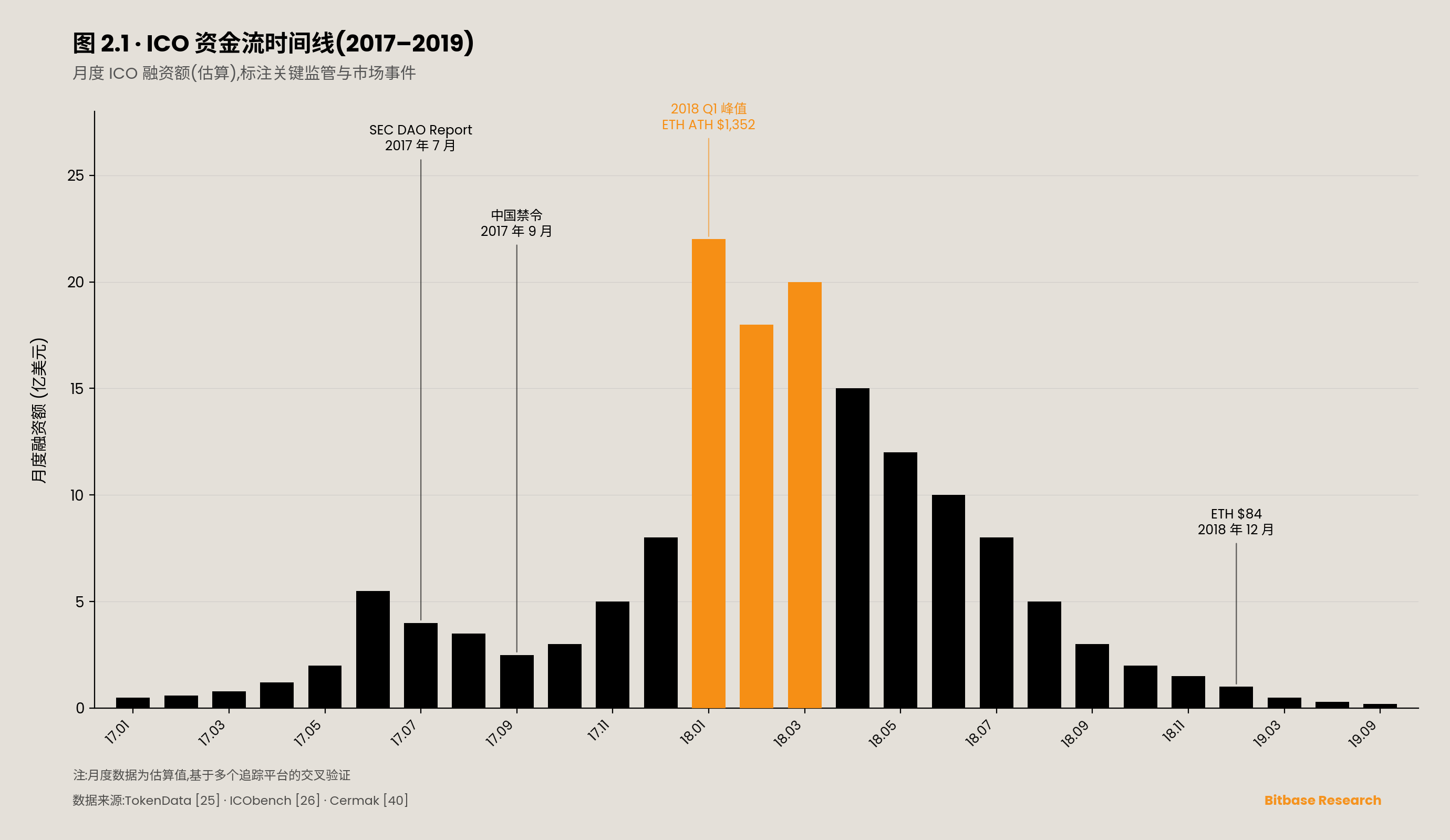 2017 年 1 月至 2018 年 7 月,全球 ICO 市场累计融资约 178 亿美元 [25],其中 2017 年全年约 50 亿美元(Swartz 2022),2018 年第一季度单季达到峰值。2017 年约有 966 个 ICO 项目完成发行,2018 年这一数字飙升至约 2,284 个 [26],高峰期每天约有 482 个代币发售同时进行。这些数字描述的是一个在十八个月内从几乎不存在膨胀到数百亿美元级别的融资市场。