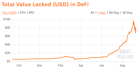 2019年6月,Compound開啟“流動性挖礦”,隨後帶火整DeFi行業,其鎖倉價值也由6月初的10億美元上漲至9月初的90億美元。同樣地,伴隨著DeFi行業的火熱,以Uniswap為代表的AMM類DEX交易量也在迅速上升,8月其日均交易量達到9.5億美元,超過美國最大的加密貨幣交易所Coinbase。為此,很多市場觀察人士認為DeFi已經對CeFi取得了巨大勝利,未來將會進一步蠶食CeFi的市場份額。