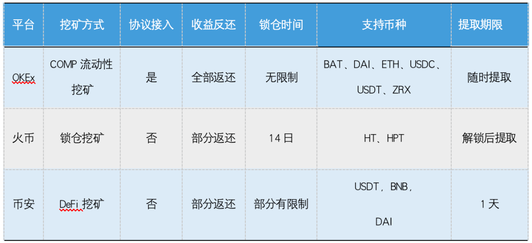 最後,Compound Earn可靈活鎖倉,隨時提取,支持BAT、DAI、ETH、USDC、USDT、ZRX六款幣種。相較於火幣推出的“鎖倉挖礦”,要求鎖倉自己的平台幣HT 14日,並且不支持鎖倉;幣安僅支持存取DAI,並且有一天的提取期限,OKEx對用戶更友好。