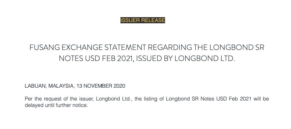 PANews 11月16日消息,香港金融科技公司Fusang Exchange發佈公告稱,應發行人要求,由中國建設銀行股份有限公司納閩分行( CCBL )發起的基於以太坊的數字債券“ Longbond SR Notes USD Feb 2021 ”將推遲上市。