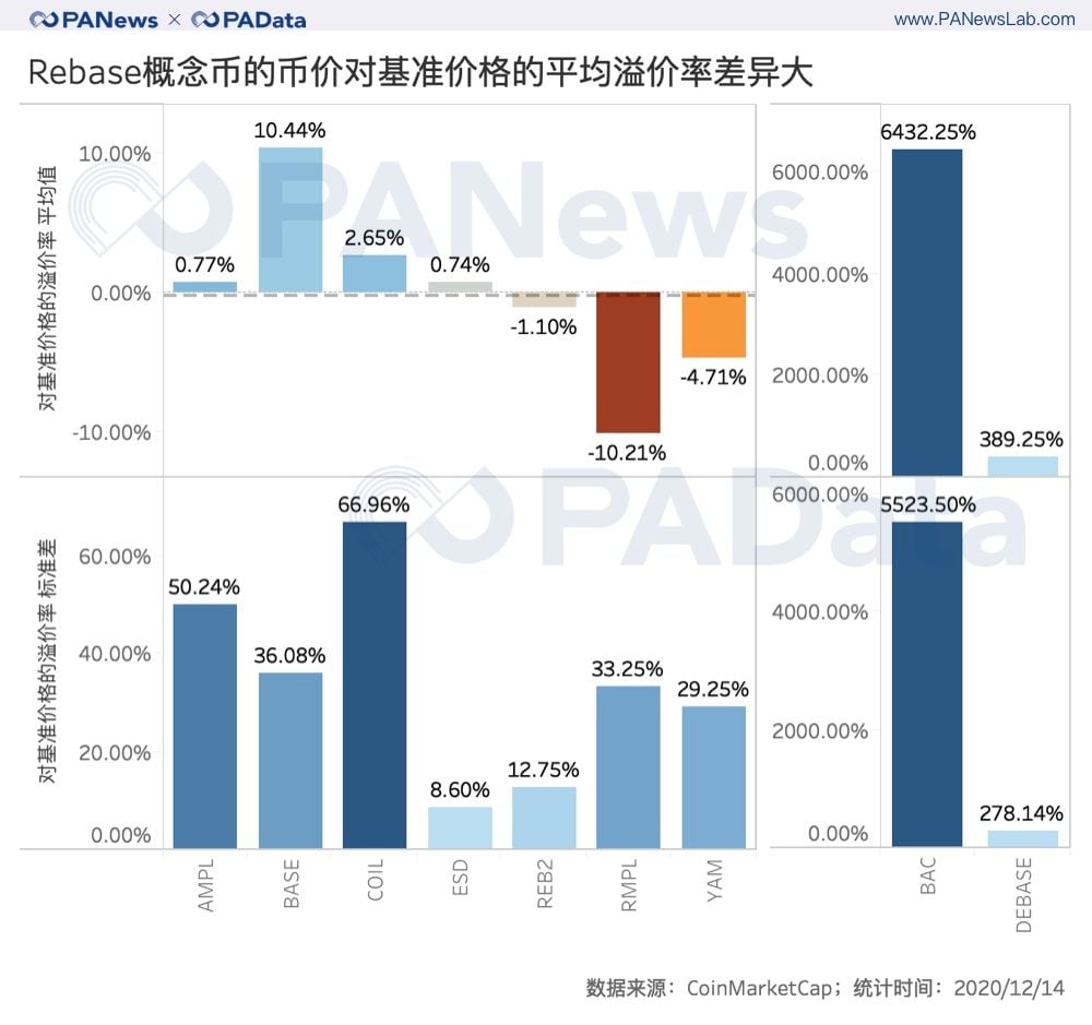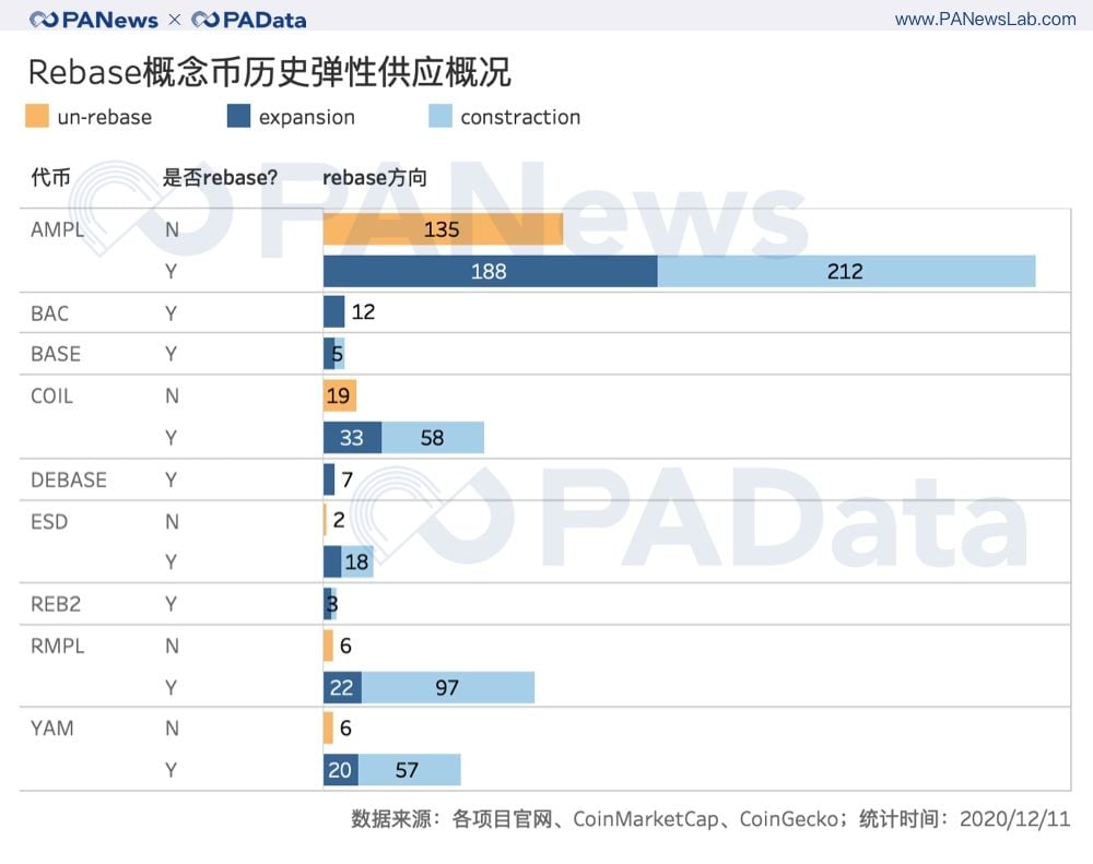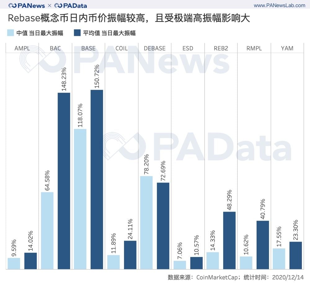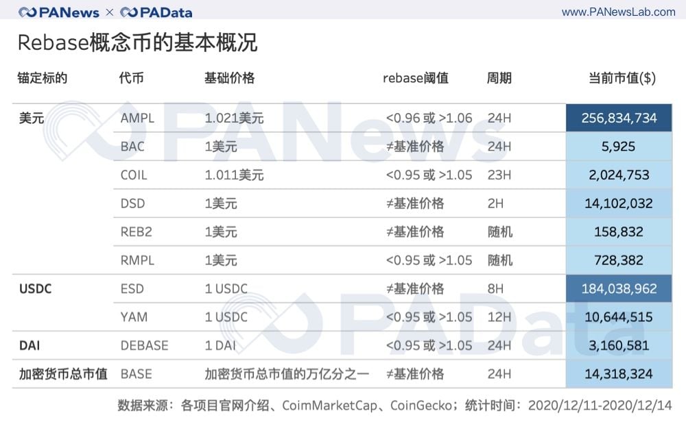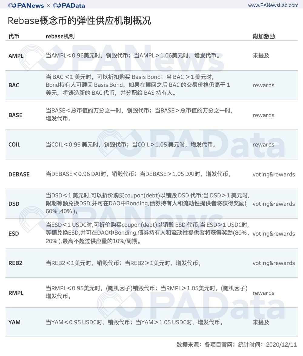 非稀釋性的彈性供應模型“走紅”幣圈。 這種經濟模型被稱為Rebase,其核心結構可以籠統地表述為,在一定週期內,當市場價格偏離基準價格或偏離基準價格一定範圍時,智能合約會直接或間接增加/減少代幣供應量以促使市場價格回歸基準價格。採用Rebase供應模型的代幣旨在保持幣價基本穩定,因此,這些代幣也被歸為算法穩定幣。 算法穩定幣並不是新鮮事物,早在2018年,市場上就出現了諸如Basecoin、Reserve、Carbon Money、Fragments等無資產抵押的算法穩定幣。但當時的主流穩定幣仍以資產抵押為主要模式,比如中心化發行的USDT、PAX、TUSD等,或去中心化發行的DAI、sUSD等。兩年後的今天,無抵押的去中心化算法穩定幣再次走入大眾的視線,展示了去中心化這一理念在除了DeFi以外的區塊鏈業態中的擴張態勢。 但是,算法穩定幣的再現並不意味著其解決了自身長期面臨的問題。這些問題中最核心的是,價格穩定是否是行業發展的普適需求?其次,穩定機制的效用是否具有長期性和穩定性?哪種機制更具有結構優越性? PAData將通過對各種Rebase機制的對比討論其背後的市場表現和博弈機會。 主流Rebase機制的比較:閾值、週期和代幣結構 Rebase機制的構成包括錨定標的、基礎價格、代幣結構、Rebase閾值、Rebase週期這五個基本要素。根據對AMPL、BASE、BAC、RMPL、ESD、YAM、REB2、DEBASE、DSD和COIL這10個概念幣的Rebase機制分析,美元仍然是最主流的錨定標的,一共涉及6種概念幣,其中,除了AMPL和COIL分別錨定2019年和2020年適應消費者價格指數通脹的1美元以外,其他4種概念幣都直接以1美元作為錨定的基礎價格。 另外,ESD、YAM和DEBASE都以穩定幣為錨定標的,區別在於,ESD和YAM錨定的是USDC,基礎價格設定為1 USDC,DEBASE錨定的是DAI,基礎價格設定為1 DAI。最“特立獨行”的概念幣是BASE,其錨定的標的是加密貨幣總市值,基礎價格為總市值的萬分之一。 在這10種概念幣中, AMPL 、 COIL 、 RMPL 、 YAM和DEBASE這5種代幣設定了彈性供應的閾值,一般為5% 。這個閾值也可以理解為一定的容錯價格範圍,即當幣價處於這個範圍內時, R ebase機制不會被觸發。如果不設置這個閾值,那麼R ebase機制的價格“敏感性”會更高,即幣價一旦偏離基準價格,機制就會被觸發。 與Rebase機制的“敏感性”相關的另一個變量是彈性供應週期。以24小時或十分接近24小時為一個週期的設定比較多見,AMPL、BAC、DEBASE和BASE都是如此設定的。另外還有一些超短週期和隨機週期的設定值得關注,比如DED的周期只有2小時,RMPL和REB2的周期則是隨機的,前者設定兩次彈性調整間隔不超過48小時,即周期範圍為0-48小時,後者規定每天最多啟動6次彈性調整,啟動人可以是任意持幣者。這些週期設定對價格穩定的影響還需要更長時間的觀察,但對持幣者而言,無疑需要更頻繁地調整持幣策略。 最後一種影響Rebase機制的構成要素是代幣結構,這也是五種基本要素中最重要的一種。按照機制發生時可能會涉及到的代幣數量,可以將代幣結構分為單幣種代幣結構和多幣種代幣結構兩種,前者以AMPL為典型代表,後者以BAC和ESD為典型代表。 單幣種代幣結構的Rebase機制通常較為簡單,即當幣價偏離基礎價格或偏離基礎價格一定範圍時,智能合約直接通過增發或銷毀這種代幣來促進幣價回歸基礎價格。比如當1 AMPL<0.96美元時,智能合約會減少持幣者錢包內的AMPL數量以促使價格回歸,反之亦然。但是,AMPL的彈性調整不是一次性實現的,而是平均至10天內完成,即每天執行總調整量的1/10,但第二天重新計算調整量後,合約將執行最新的調整量而不執行歷史調整量,也即實際上,當AMPL連續調整時,每次執行的彈性調整隻是目標調整量的1/10。 複雜的執行機制在一定程度上降低了簡單代幣結構可能帶來的高度靈敏的價格反應性,即高自反性。不過,這種組合不是必須的,類似BASE這樣的代幣就沒有設計複雜的執行機制,其彈性調整是一步到位的,其價格反應性相對也更激烈。 多幣種代幣結構的Rebase機制通常與DeFi理念有更深層次的構連。比如BAC的機制中就包含BAC和BAS這兩種代幣,當BAC低於基礎價格時,持幣人可以折扣購買Basis Bond,這實際是一種債券憑證,等到BAC高於基礎價格時,債券持有人可贖回Basis Bond,如果在贖回之後BAC 的交易價格仍高於基礎價格,將鑄造新的BAC代幣,並分配給BAS持有人。與之相似的還有ESD和DSD,雖然這不是標準的多代幣結構,但其核心機制類似多代幣結構機制。當幣價低於基礎價格時,系統為持幣人提供折價(與系統債務率有關)債券以激勵其銷毀代幣,這種債券被稱為“優惠券(coupon)”,等到價格高於基礎價格時,“優惠券”可以在規定期限內等額兌換,並且此時,系統還鼓勵持幣人將代幣存入DAO中以獲得獎勵。因此,理論上,增加的供應量將會流向DAO而不是流通市場。 目前Rebase概念幣與DeFi的構連還體現在流動性激勵方面,不少代幣都推出了獎勵方案,如果持幣人在AMM DEX中成為流動性提供者就可獲得一定的獎勵。 從目前各Rebase概念幣的交易市場構成中可以明顯的看到這一點,包括BAC、ESD、BASE等在內的8種Rebase概念幣的主要交易份額都來自Uniswap。 AMPL目前是市場接受度最高的一種Rebase概念幣,其主要交易份額來自Hotcoin、Kucoin和Uniswap,YAM由於遷移問題,目前YAM v3的代幣YAM主要來自Gate.io。 日內振幅普遍較高,AMPL和ESD對基礎價格的偏離低 Rebase機制的目的在於保持幣價穩定,或在