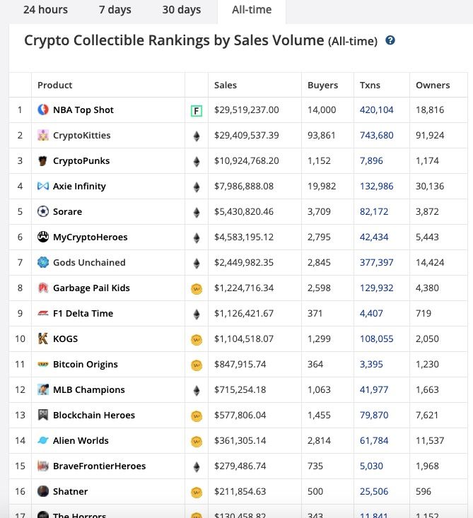 PANews 1月26日消息, CryptoSlam數據顯示,基於區塊鏈的NBA球星卡牌遊戲NBA TOP Shot的歷史成交額達2951.9萬美元,擁有14000名買家和18816名收藏者,位列各類NFT收藏品之首;排名第二的CryptoKitties的歷史交易額2940.9萬美元,擁有93861名買家和91924名收藏者。