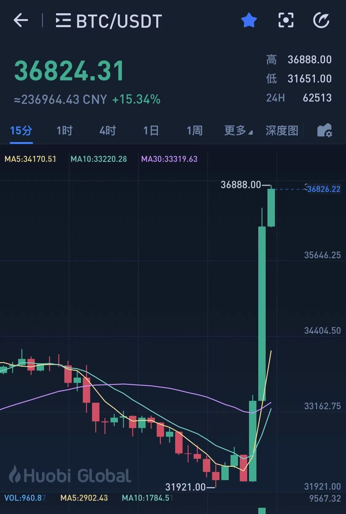 受此影響,比特幣價格短時拉升。截至發文,火幣全球站數據顯示,目前比特幣價格為2 3824萬美元,日內漲幅逾15.3% 。
