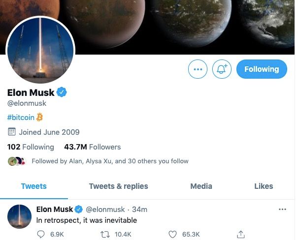 PANews 1月29日消息,特斯拉CEO埃隆·馬斯克將推特主頁簡介改為“ bitcoin” ,並表示, “回想起來,這是不可避免的” 。
