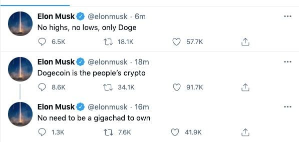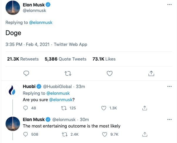 PANews 2月4日消息,特斯拉CEO埃隆·馬斯克在推特發文,“ Doge” ,並在回复火幣時表示,最有趣的結果是最可能的。