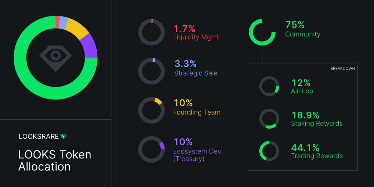 Looks總量為10億枚,分配給社區的佔75%,包括空投(12%)、質押獎勵(18.9%)、交易挖礦(44.1%)。團隊、國庫、戰略投資分別佔10%、10%、3.3%,該部分鎖倉兩年。