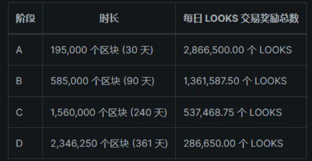 - 交易挖礦獎勵減半。 LooksRare交易挖礦獎勵分為四個階段,每個階段中每次獎勵數額固定,不同階段的獎勵數額依次減半,緩衝項目發展中後期的拋壓。