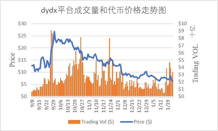 雖然dydx的交易挖礦激勵機制增加了定額限制,以及變相鎖倉,能一定程度減緩拋壓。但是代幣DYDX 的捕獲價值有限,其用途主要是質押獲取DYDX獎勵,以及參與項目的投票治理。加上前期追溯性空投(佔比7.5%),導致市場拋壓大,幣價也從高點遭遇大幅下跌。