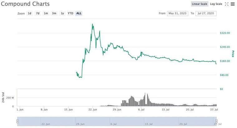 憑藉“借貸即挖礦”激勵方案,Compound迎來短暫的高速增長。啟動僅20天后,Compound的TVL從1.8億美元增長到6.5億美元,增幅約260% 。代幣COMP上線Uniswap後,幾小時內漲幅約500% ,其市值達到當時DeFi龍頭MakerDAO的2倍。