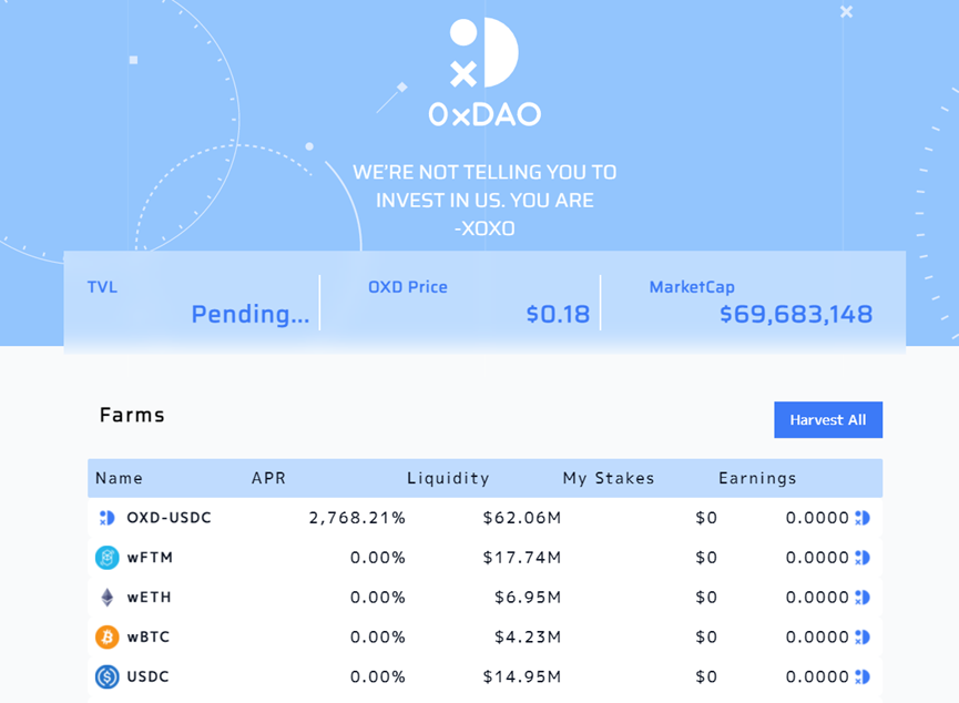 0xDAO祭出「戰旗」,專門打擊那些從Fantom長期建設者那裡吸引短期流動性的組織,喊出「保障用戶資金安全」的口號,但戰法和VeDAO類似——用戶通過鎖倉單一Token或提供流動性,獲取0xDAO治理通證OXD獎勵,目前支持用戶鎖倉的單一資產為FTM、ETH、USDC、DAI等資產,LP池包括OXD-USDC。