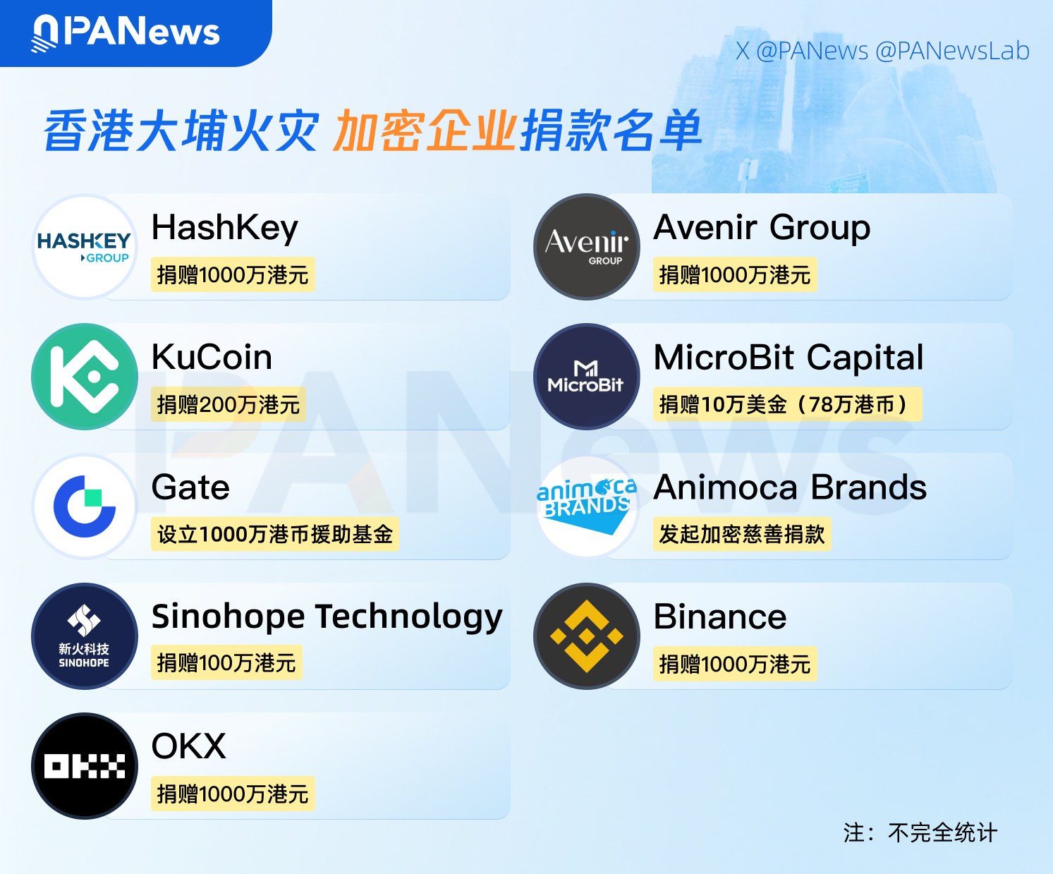 香港大埔火災引發社會各界關注,除了傳統企業,加密企業如HashKey Group、Avenir Group、Kucoin等也紛紛捐款捐物,展現社會責任感。救助行動持續進行,共同期盼更多奇蹟,支持香港度過難關。