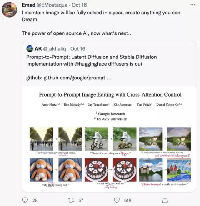 這就是所謂的交叉注意力控制(Cross-Attention Control)技術,連StabilityAI 創始人也不禁為這項技術點贊:“在類似技術幫助下,你可以去創造任何你夢想的事物。”