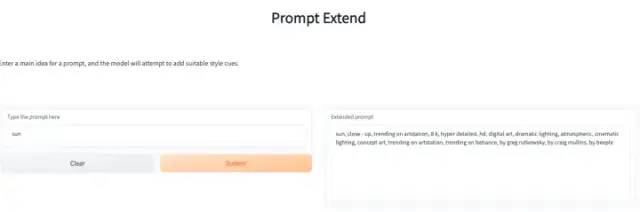 除了直接以圖片進行反推外,還有一種工具如Prompt Extend,可以一鍵加長Prompt,可以將一個小白用戶輸入的“太陽”一鍵加長到帶有豐富藝術修飾的“大神級”描述,工具地址——