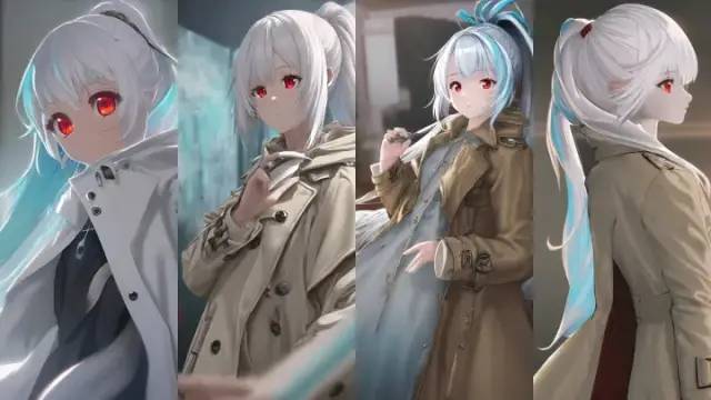二次元模型對於畫特定形象的人物十分擅長,比如在如下的連續出圖中,我們大致可以認為都是一個“主人公”(稱之為白小蘇蘇)在變Pose 或者換裝。因為我們給予AI 的描述中對該人物進行了極為細緻的刻畫,就像固定了她的基因一般,加上二次元模型本身對於人物的勾畫(平圖)相對於真實人物就“粗放”一些,只要重要人物特徵一致,便可以判別為同一個人。