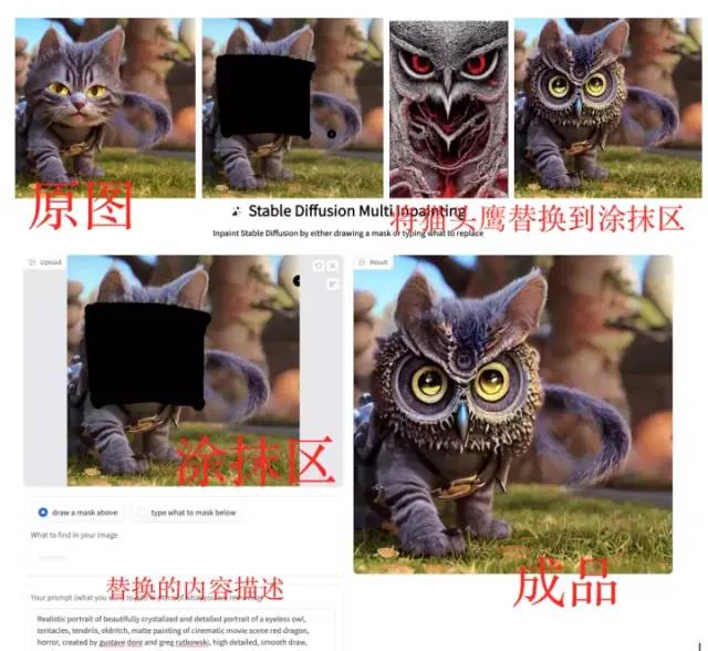說到了精準控制,它不是某一項技術,交叉注意力是其一,還有很多輔助性手段為其服務,最為流行和商業成熟的是inpainting 和outpainting 技術。這是傳統設計領域的概念,AI 藝術也繼承了過來。當前SD 也推出了inpainting 功能,可翻譯為“塗抹”,即對於畫面中不滿意的部分進行“塗抹”,然後AI 會在塗抹區重新生成想要替換的內容,具體見下圖操作。