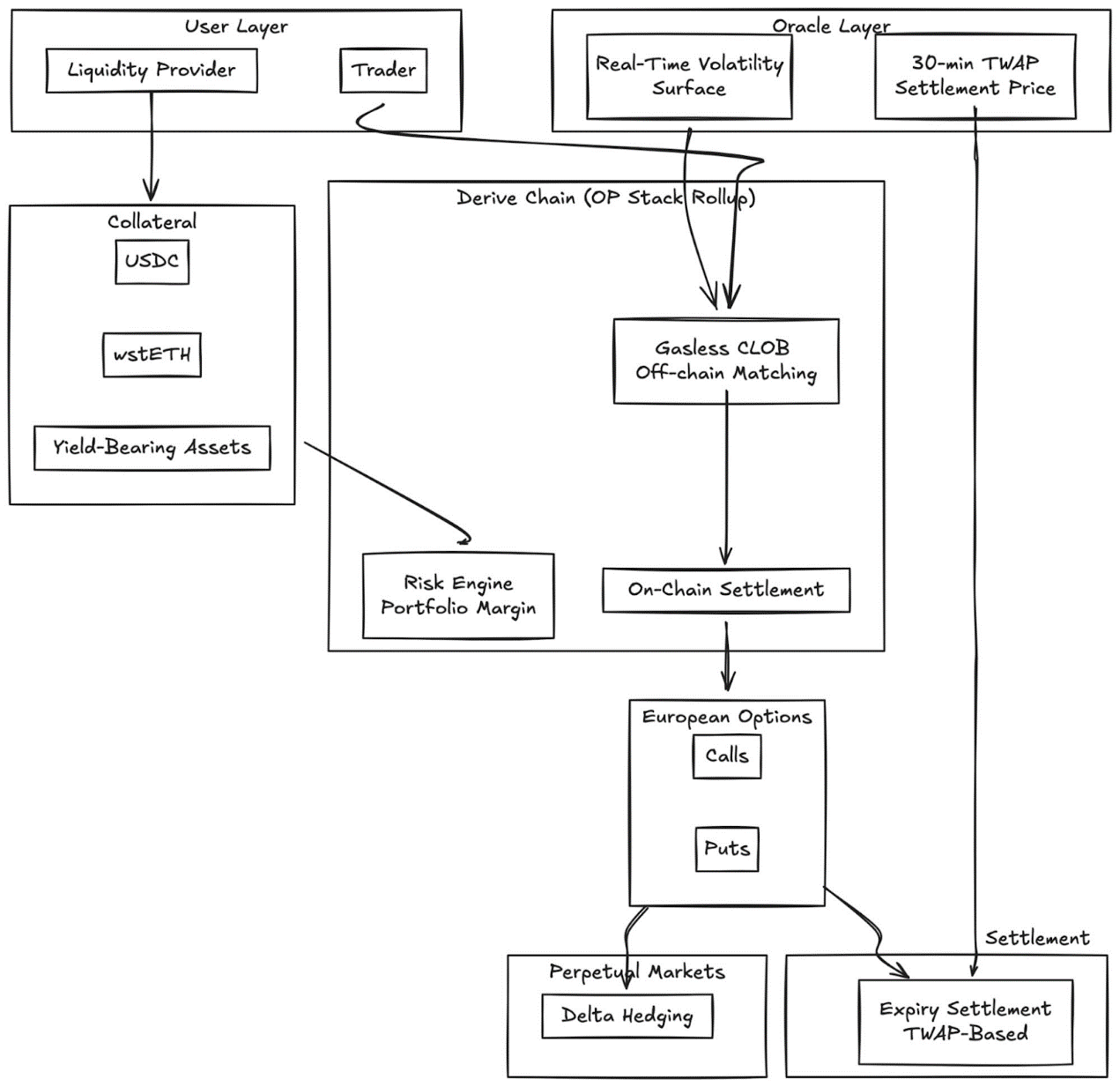 Derive(前身為Lyra)已從其開創性的AMM 架構過渡到無Gas 費用的中央限價訂單簿,並採用鏈上結算。該協議提供完全抵押的歐式選擇權,具有動態波動率曲面和基於30 分鐘TWAP 的結算。