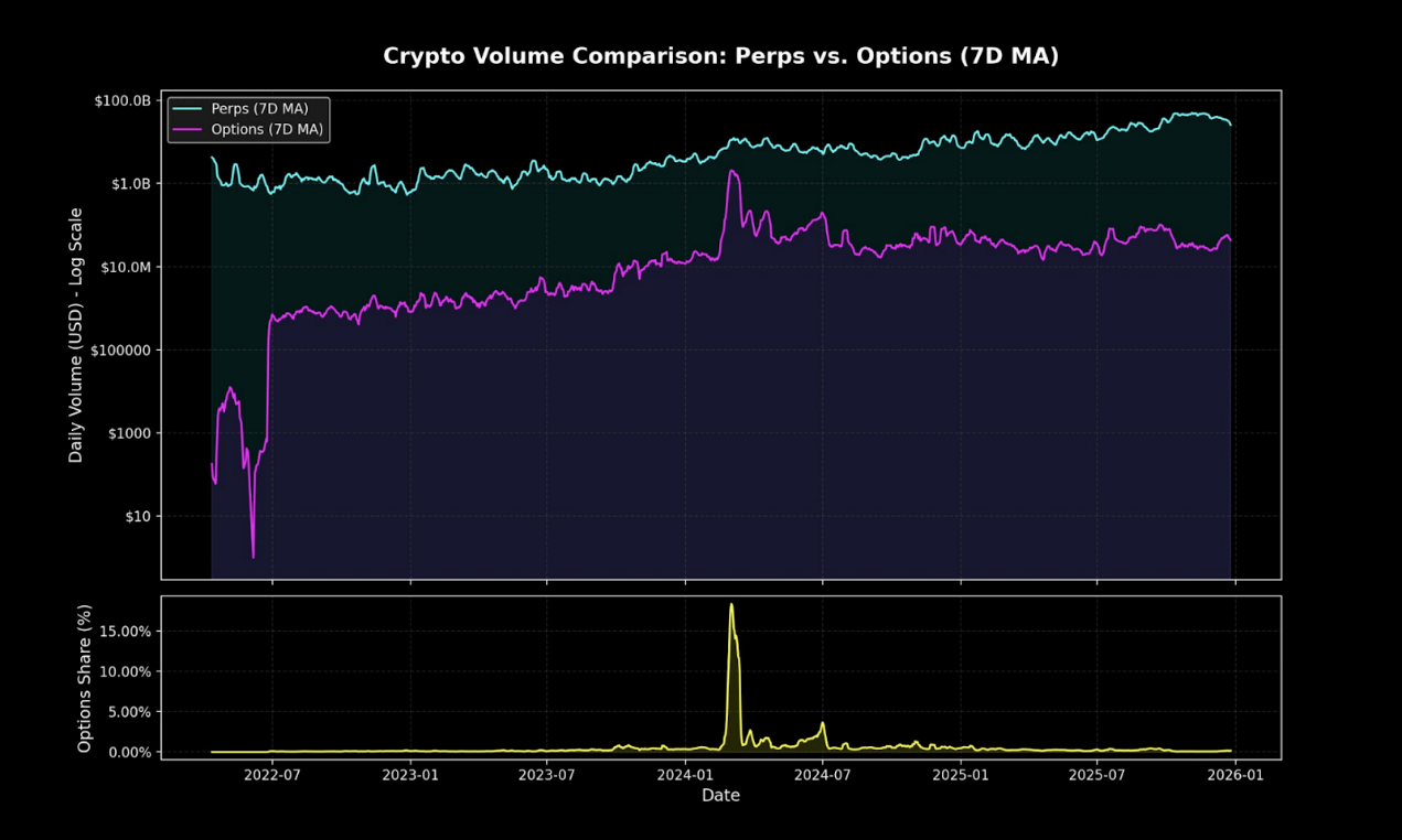 儘管目前鏈上選擇權僅佔加密衍生性商品交易量的一小部分,但永續合約在市場中仍佔據絕對主導地位。這種差距與TradFi 選擇權在Robinhood 普及之前的情況如出一轍。