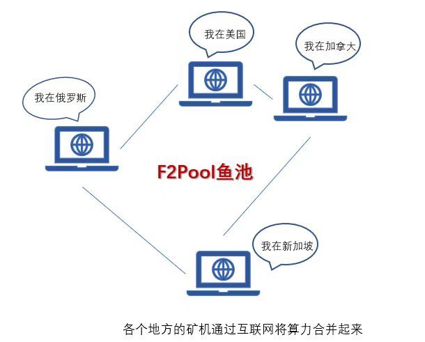 白話點講,就是把單個的礦機集合起來(即礦機接入礦池的過程),然後大家一起提供算力,最後一起獲得收益,再按一定的分配機制分配收益。這樣一來,單個礦機獲利就會比較的穩定。而且礦池是若干礦機算力的集合,它是一個平台,它不受區域的限制,比如F2Pool魚池,它的礦機分佈在美國、加拿大、新加坡、俄羅斯等全球多個國家。