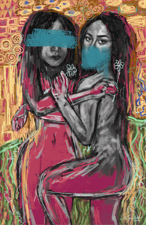 "Us" 的靈感來自古斯塔夫·克里姆特的"吻"。在她的作品中經常看到花朵,因為它是成長、潛力和脆弱性的象徵,也是女性的象徵。 Vyankka 希望創建一個數字版本,以反映她現在的狀態。通過Vyankka 的作品,似乎她始終要確保觀者能感受到一種情感;高對比度,鮮明的色彩,醒目的筆觸,粗曠的線條和強大的敘事感,都共同傳達了她作為女性希望觀者感受到的情感。