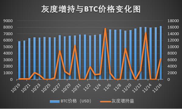 Odaily星球日報統計了10 月19 日到11 月16 日,GBTC 增持量與BTC 價格的關係。