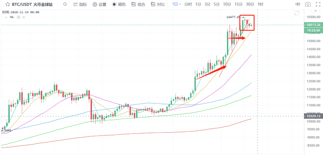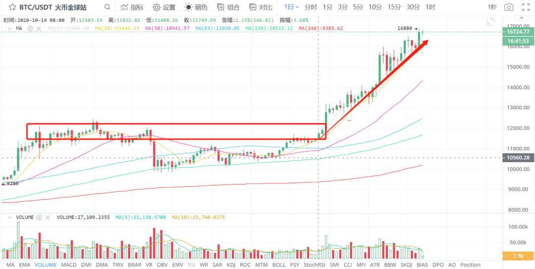 同時,從技術圖上看,BTC 突破12000 美元後,越往上攻阻力越大,但卻仍然保持了健康的上攻走勢。