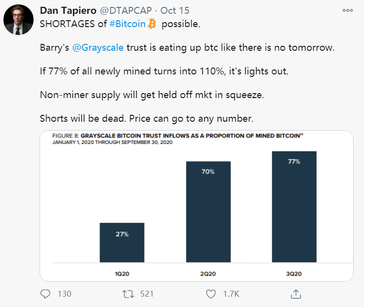將時間線拉長一些,宏觀投資者Dan Tapiero 表示,灰度信託購買的比特幣佔挖礦產生的比特幣份額,從Q1 季度的27% 增長至Q3 的77%。