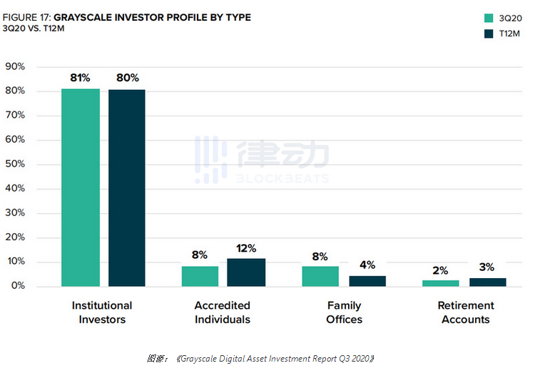 根據灰度2020 年第三季度披露的數據顯示,灰度旗下產品購買用戶主要是機構投資者(81%),其次為合格投資者和家族辦公室(各8%)。購買用戶有57% 來自於美國以外地區。