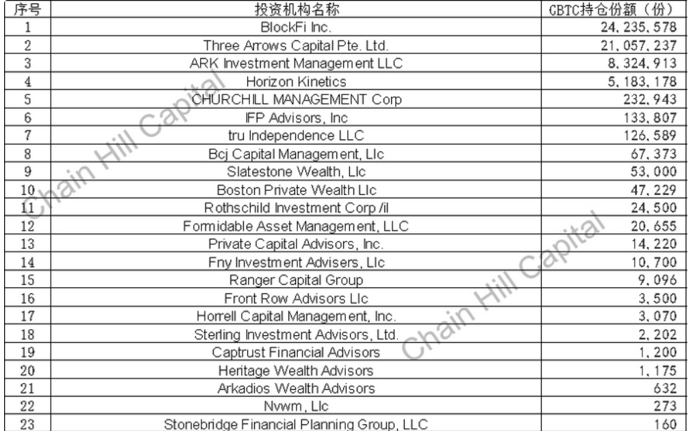 截止2020 年11 月9 日,根據已公開披露的信息,共有23 家公司(合計29 個機構級賬戶)持有灰度比特幣信託份額,持倉信託份額數總計5955.32 萬份,佔灰度比特幣信託已發行份額的11.55%(注:統計口徑為機構在美國SEC 公開披露的信息,機構持有的信託份額在不同報告期會有所變動,本文統計截止2020 年11 月9 日仍然持有信託份額的機構)。 23 家公司中包括了加密資產借貸公司、對沖基金、共同基金、私人財富公司、諮詢顧問公司、家族辦公室等。
