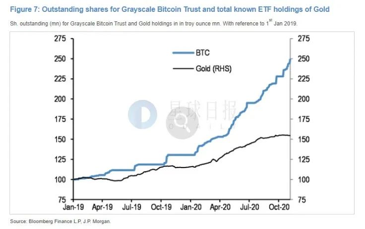 老一輩手中的財富開始向年輕一代人手中轉移。灰度在《財富大轉移推動BTC成為主流投資標的》的報告中稱,雖然比特幣在早期階段只是一種吸引少數投資者的利基型資產,但現在正越來越被主流投資者所接受。調查數據顯示:2019 年比特幣潛在市場投資人數約為2100 萬,但2020 年已經增長到了3200 萬。 2019 年有53% 的投資者表示自己“熟悉”比特幣,但2020 年已經增長到了62%。有超過50% 的受訪者預測,數字貨幣會在2030 年之前成為主流。雖然目前大多數比特幣投資者手上沒有太多收入,但未來25 年內將會有68 萬億美元財富轉移到傾向於數字貨幣投資的年輕一代手中。摩根大通(JPMorgan)市場量化分析師尼克·潘尼吉爾佐格洛(Nick Panigirtzoglou)認為,“隨著時間的推移,千禧一代將成為投資世界中最重要的組成部分,因此比特幣和黃金會展開激烈競爭,這對於比特幣長期上行是有利的。從技術上看,比特幣市值應該至少會上漲10 倍,這樣才能與基於實物金條和金幣的黃金市場相匹配。”傳統機構投資者開始將傳統資產向數字資產轉移。機構投資者戰略持倉GBTC 的根本原因就在於機構投資者認識到:數字化時代已經到來且不可逆轉,越來越多人會轉向數字形式的資產,人類的財富正在進行一場大遷移。 11 月9 日,摩根大通(JPMorgan Chase)在一份報告中指出,比特幣正在蠶食市場對黃金ETF的需求。如今,家族理財室等機構投資者將比特幣視為黃金的數字替代品,其對Grayscale 旗下比特幣信託的需求也超過了所有黃金ETF的需求總和。