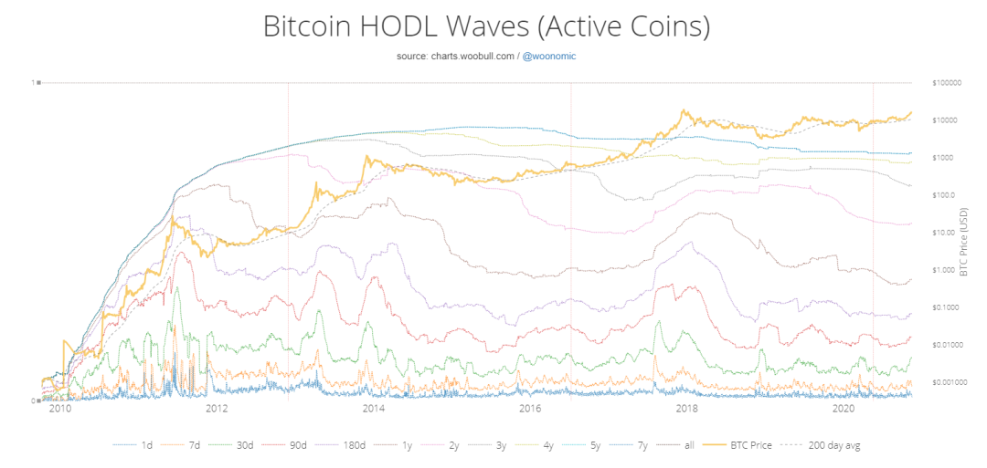 據BTCparser 監測,在11 月7 日,1000 枚2010 年開采的BTC 被轉移,今年10 月3 日,有50 枚2010 年開采的BTC 首次發生轉移。下圖從更大周期展示了BTC 籌碼的轉移。
