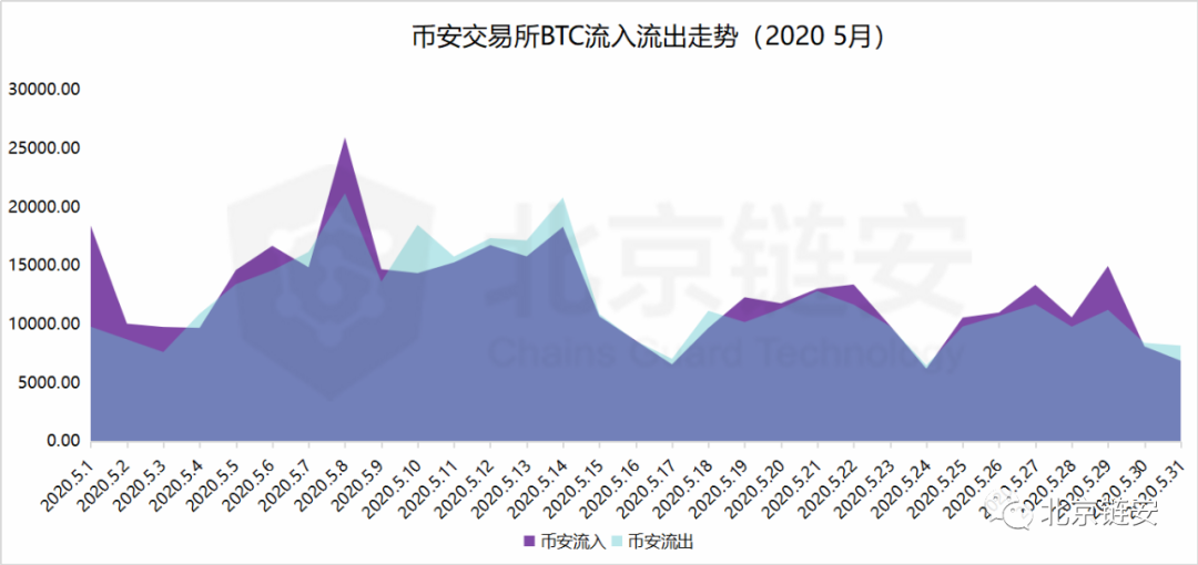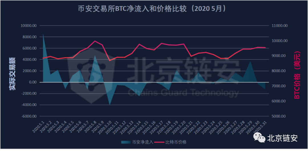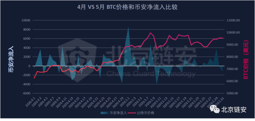 從2020年5月的31個自然日幣安比特幣淨流入和幣價對比來看,趨勢更為明顯,幣安比特幣淨流入主要發生在月初的價格攀升階段,此後,比特幣進入10000美元下的震盪期,其比特幣的流入和流出在下半月整體呈現一種相對均衡狀態。