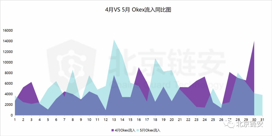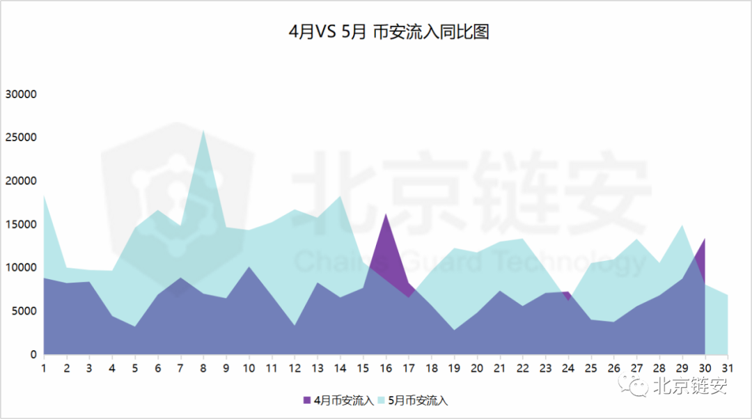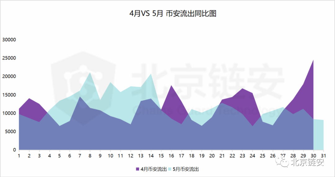 從整個5月份,即5月1日到5月31日來看,幣安交易所流入392394.04BTC,流出374978.39BTC,淨流入17415.66BTC,與2020年4月的10890.29BTC淨流入相比,增長明顯。