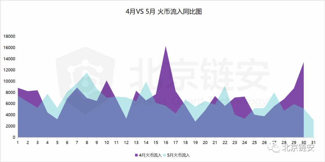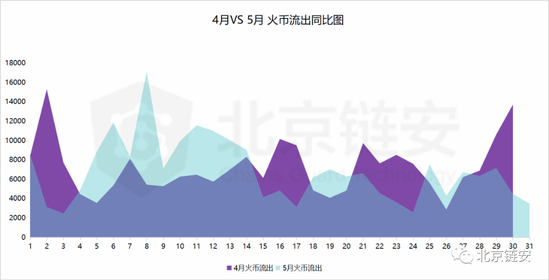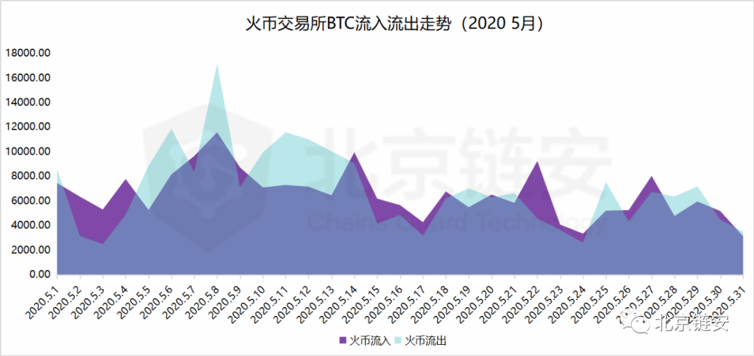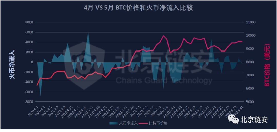 從2020年4月和5月兩個月的火幣比特幣淨流入與價格比較來看,同樣也是在幣價攀升波動期比特幣的淨流入波動較大,在幣價處於10000美元波動期後,相對均衡,但是火幣的淨流入波動相對幣安又更大一些。