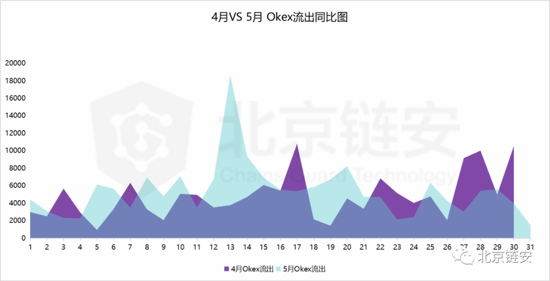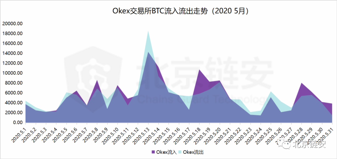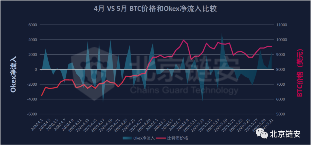 從2020年4月和5月兩個月的Okex的比特幣淨流入與價格比較來看,整體數據波動比另外兩大交易所更大。